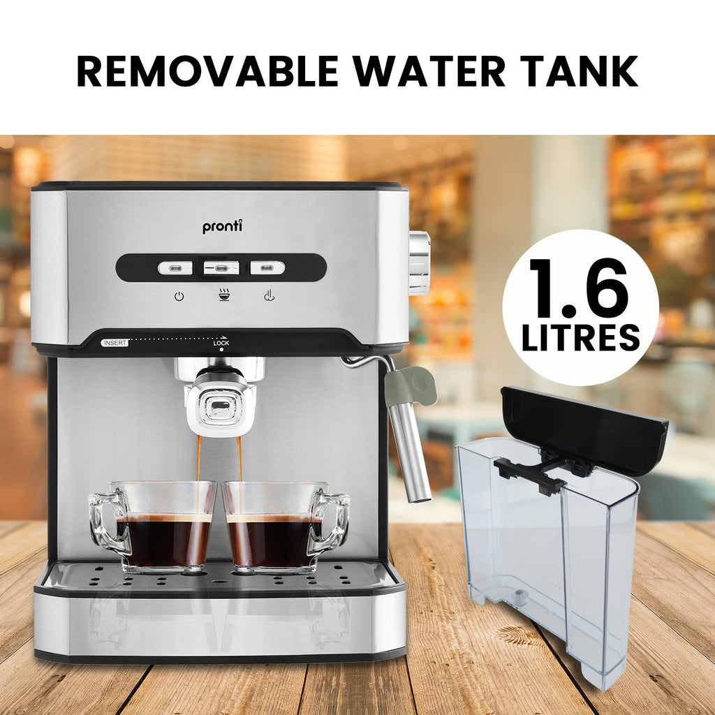 In the mood for a cappuccino? Pronti's 1.6L espresso machine features a built-in steamer wand to produce delicious and frothy milk for your coffee!